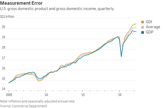 The gap between gross domestic product and gross domestic income is the widest in records going back to 1947. GDP measures the value of goods and services produced in the U.S., GDI measures incomes earned and costs incurred in that production. They're two different ways of calculating economic activity and should be about equal. Instead, one shows the economy growing, the other shrinking. That suggests that the Commerce Department is having a hard time measuring the economy right now, and some pretty significant revisions could be forthcoming.