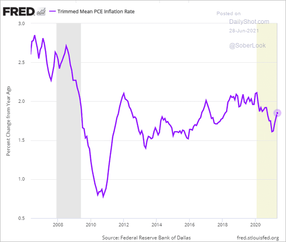 The FOMC pays a lot of attention to the Dallas Fed’s inflation measure: the trimmed mean. The trimmed mean measure of inflation is well contained.